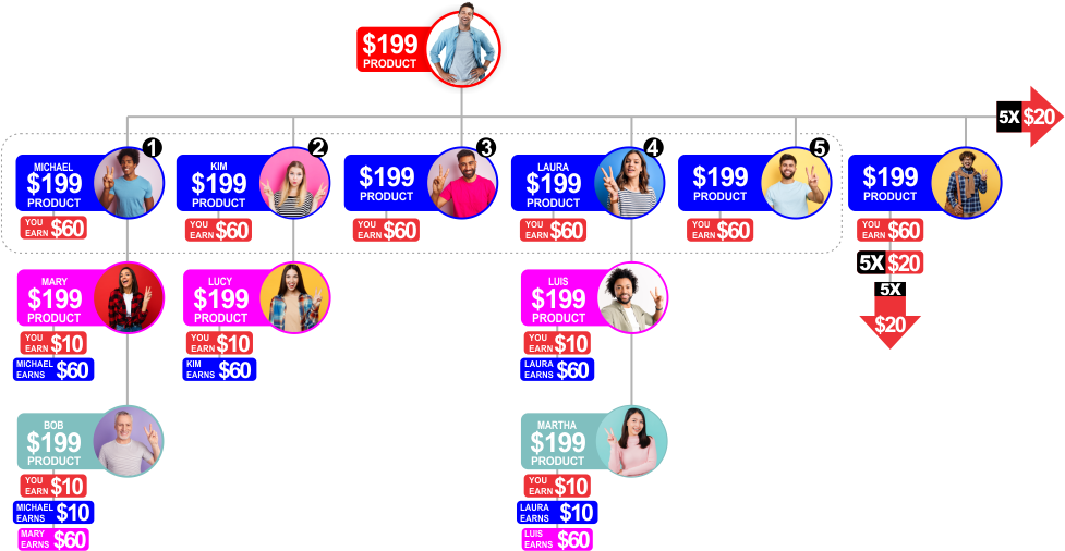 $60 Level 1 $10 Level 2 $10 Level 3 1 personal pays level 1, 2 personals pays level 2, 3 personals pays level 3. X-Code $20 5X, Need 5 personals. $20 10X, Need 10 personals. $20 20X, Need 20 personals. *Earn on the 3 level unilevel and up to $60.00 unlimited levels deep on the x-code from the 1st level down. **20X generation bonus. When you're a 20X and a 20X is created in one of your legs you get a $5 generation bonus down to the next 20X. |